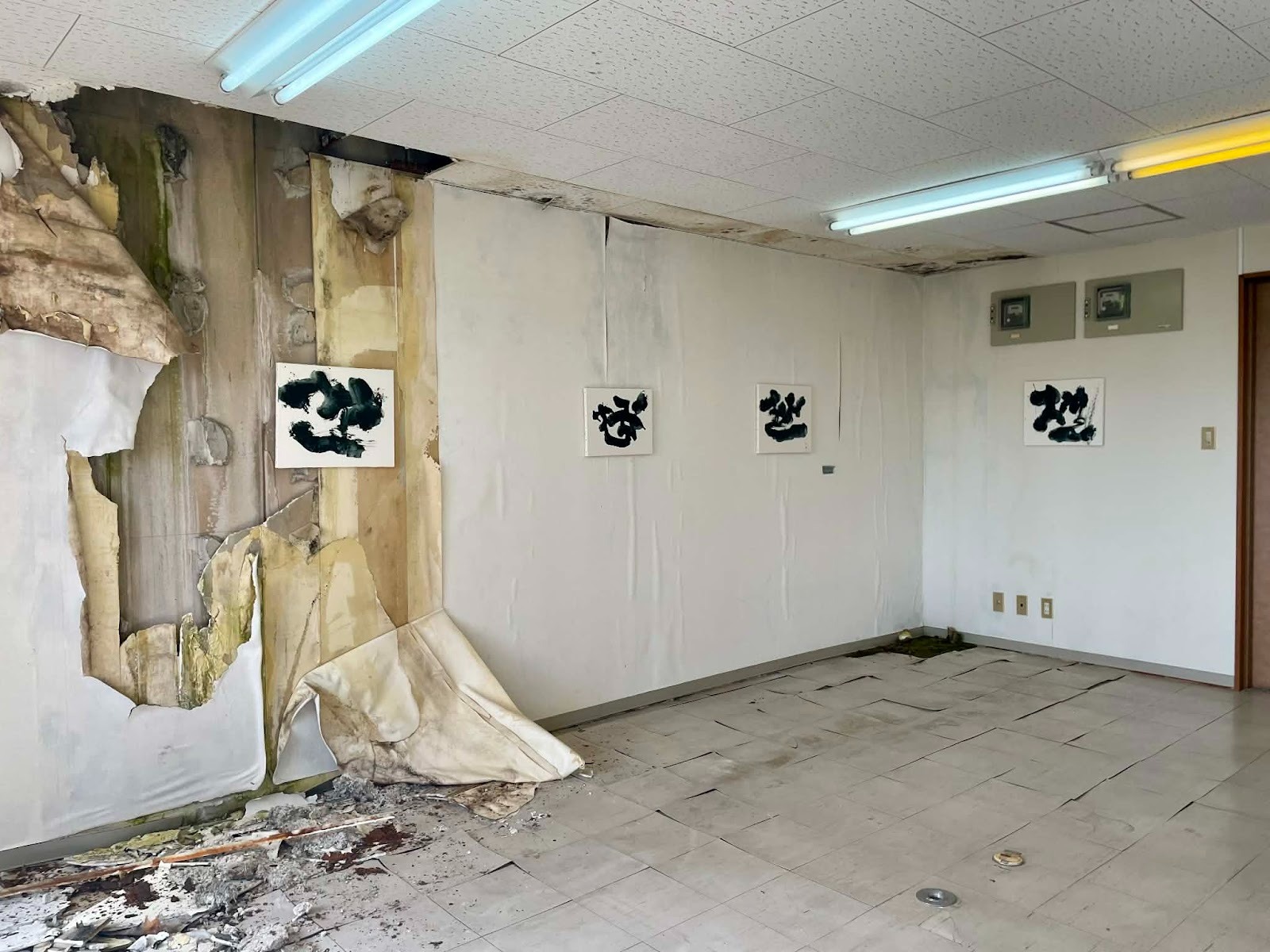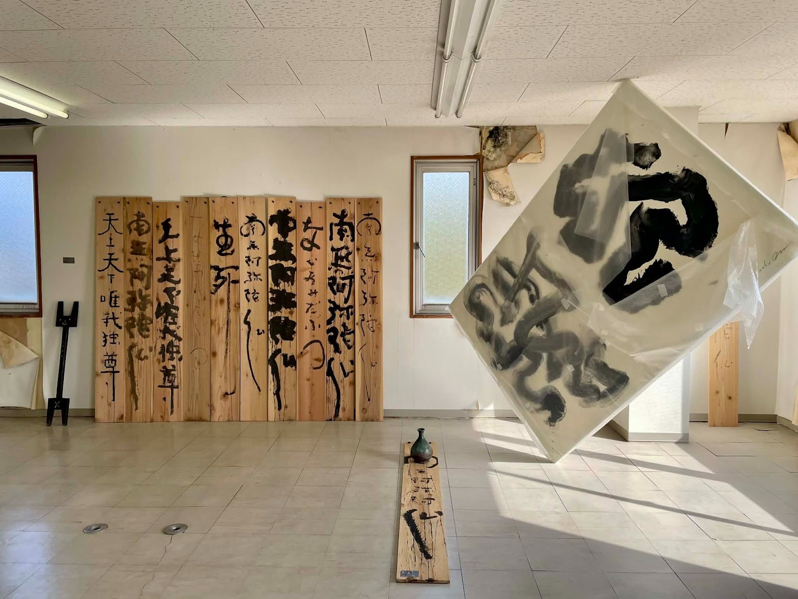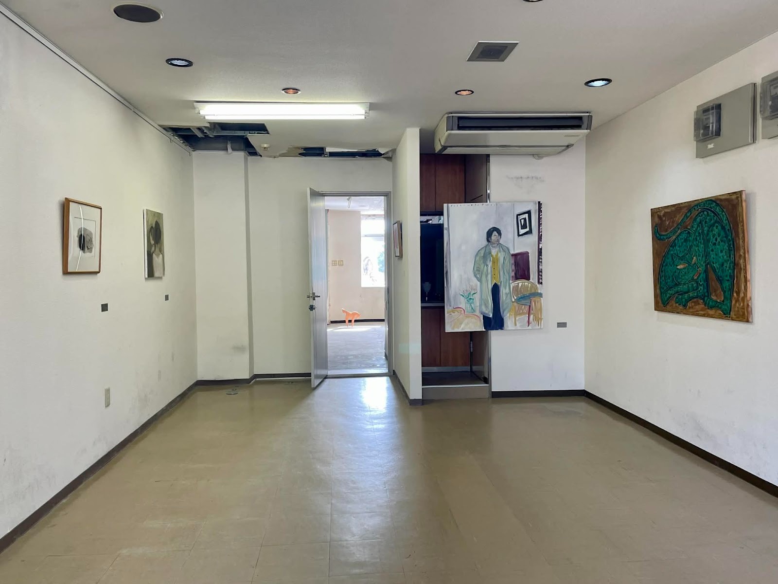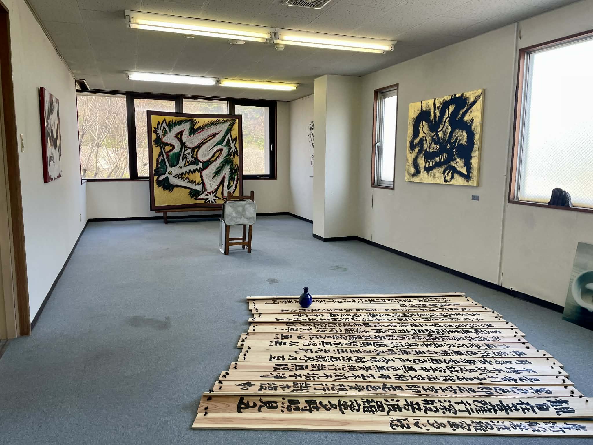 僕自身、ホワイトキューブのギャラリーであまり展示したことがないんですよね。嫌いではないんですが、こういう個性のある空間の方が面白い。だから絵も、空間の持ち味を生かして壁と会話してはめ込んでいく感じで。展示する壁面そのものの中でのインスタレーションとして捉えています。ここでしか味わえない展示空間が魅力です。